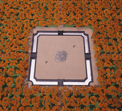 Das Zentrum wird von einer quadratischen Sandfläche gebildet, ringsum eingefriedet von einem Graben mit fließendem Wasser. Der Graben wird von vier Stegen überspannt. Jeweils ein Steg mittig zu einer Seite der quadratischen